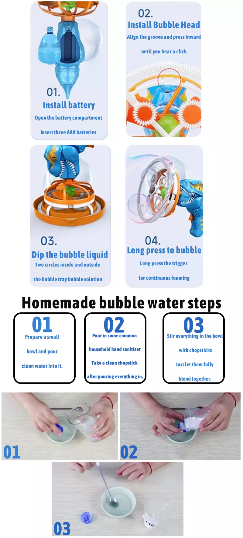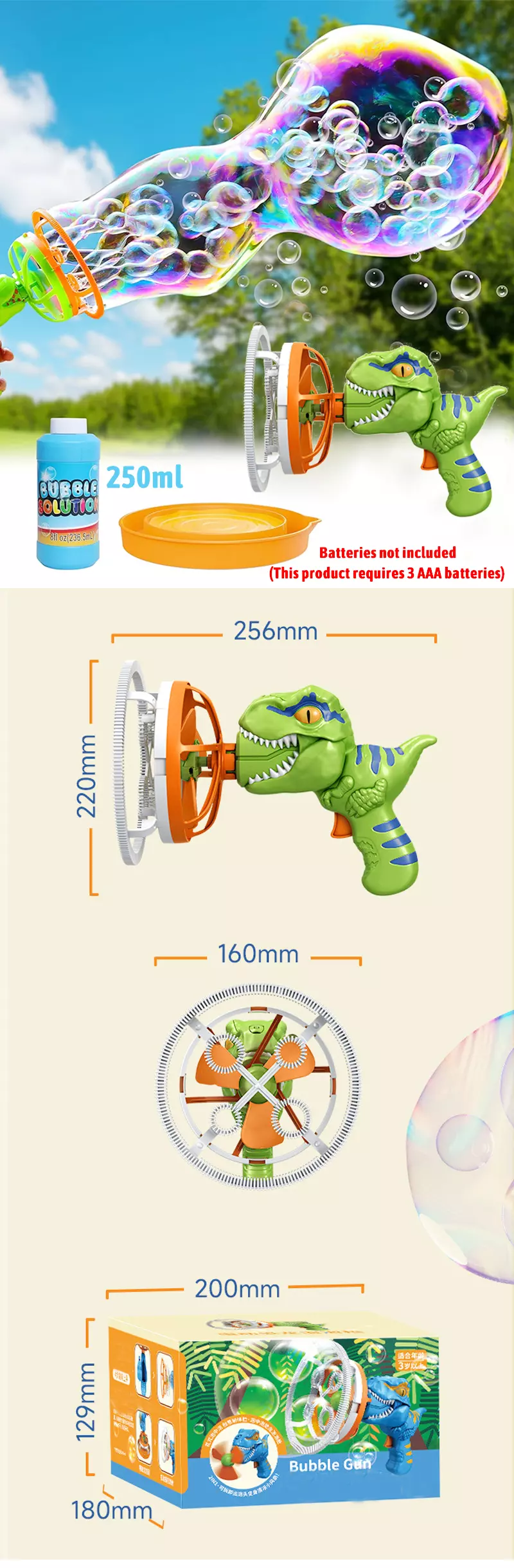 يمكن أن تنتج أكثر من 1000 فقاعة ملونة في الدقيقة ، مما يزيد من متعة وتسلية استخدام المنتج! ⚠ يحتاج هذا المنتج إلى إحضار 3 بطاريات AAA خاصة به. (بطاريات غير مدرجة)